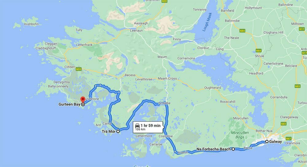 I plotted a route that would take us past Inverin and onto Costelloe. Bypassing the Carraroe peninsula, then Screebe, before going straight to Carna, where I had planned a stopover at Trá Mór. Next, Cashel, Roundstone and Clifden. Heading back to Galway via our usual direct route. A total round trip that is just over 200km.